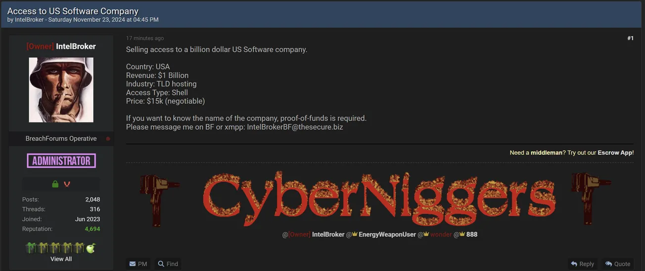 Notorious Threat Actor IntelBroker is Claiming to be Selling Access of an Unidentified Software Company in USA