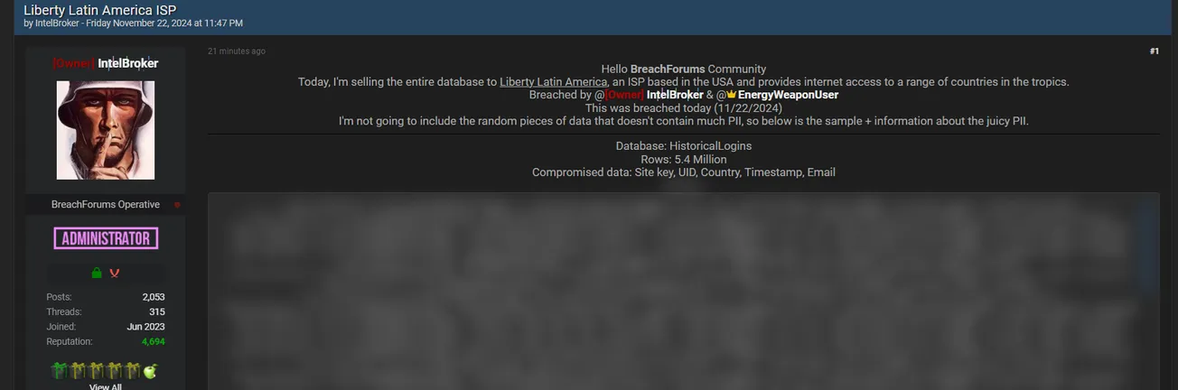 Notorious Threat Actors IntelBroker and EnergyWeaponUser Claim to be Selling the Database of Liberty Latin America