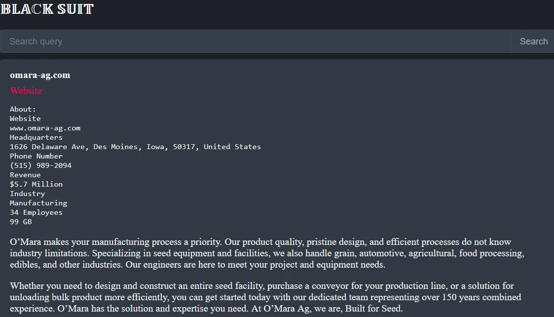 O'Mara Ag Equipment Has Been Claimed a Victim to BLACK SUIT Ransomware