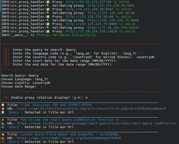 Proxy Validation: ⚙️ The tool validates proxies for secure and efficient web requests, ensuring anonymity and privacy during the search process. This feature enhances the reliability of the search results by utilizing a pool of validated proxies, mitigating the risk of IP blocking and ensuring seamless execution of the search queries.