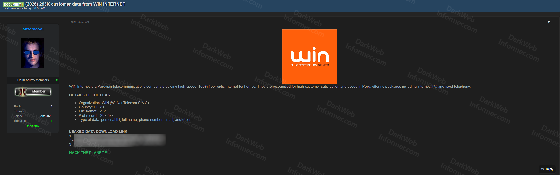 A threat actor using the handle "abzerocool" claims to have leaked customer data from WIN Internet (W-Net Telecom S.A.C.), a Peruvian telecommunications company providing high-speed, 100% fiber optic internet for homes. The company is recognized for high customer satisfaction and speed in Peru, offering packages including internet, TV, and fixed telephony.