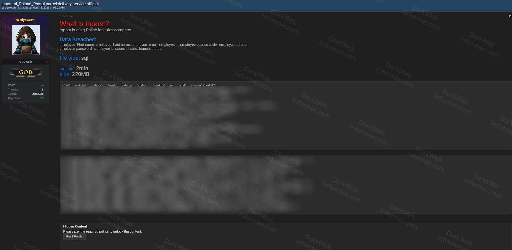 A threat actor using the handle "aiyewumi" claims to have breached the database of InPost, described as a major Polish logistics company specializing in postal and parcel delivery services. The exposed data is reportedly in SQL format and approximately 220MB in size, containing around 2 million employee records.