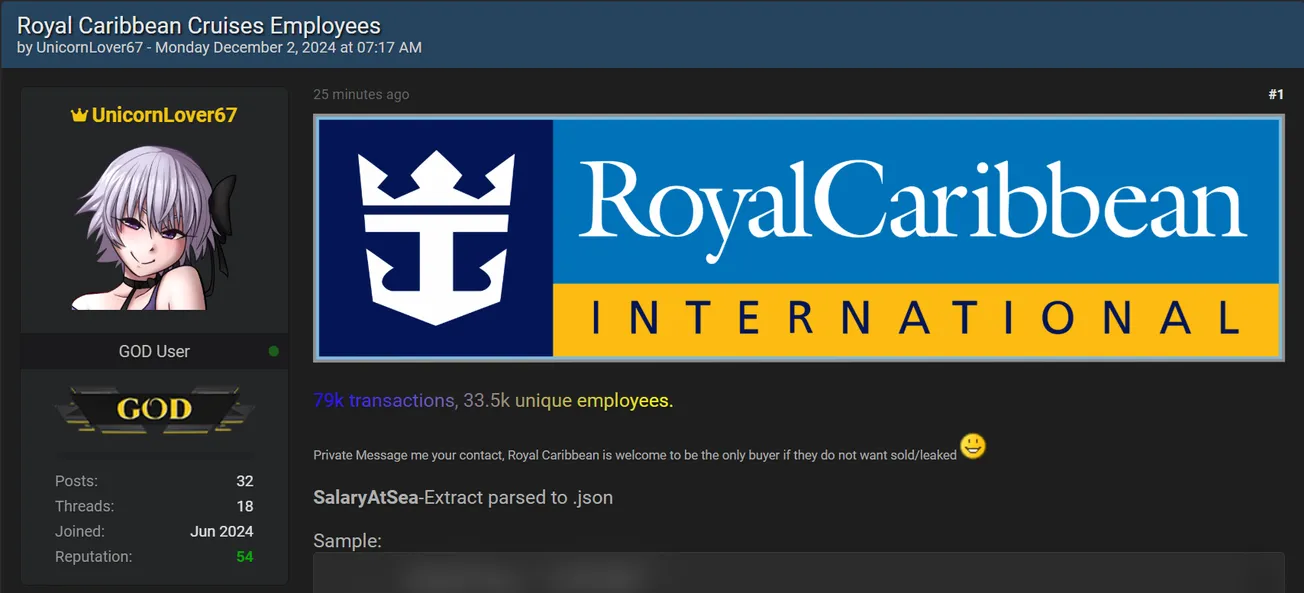 🚨 Title: Alleged data sale of Royal Caribbean International