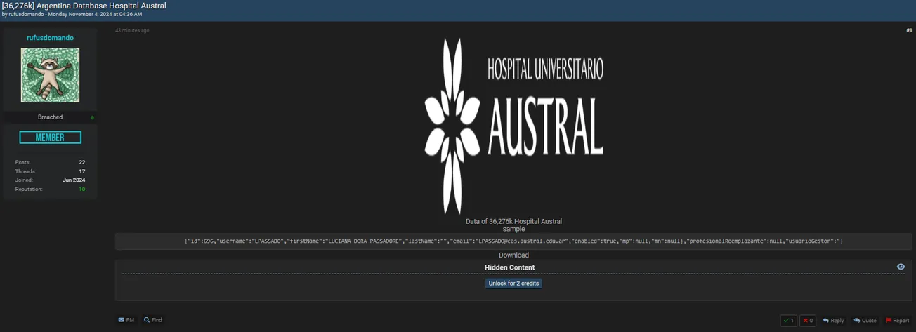 🚨 Title: Alleged data leak of Hospital Universitario Austral