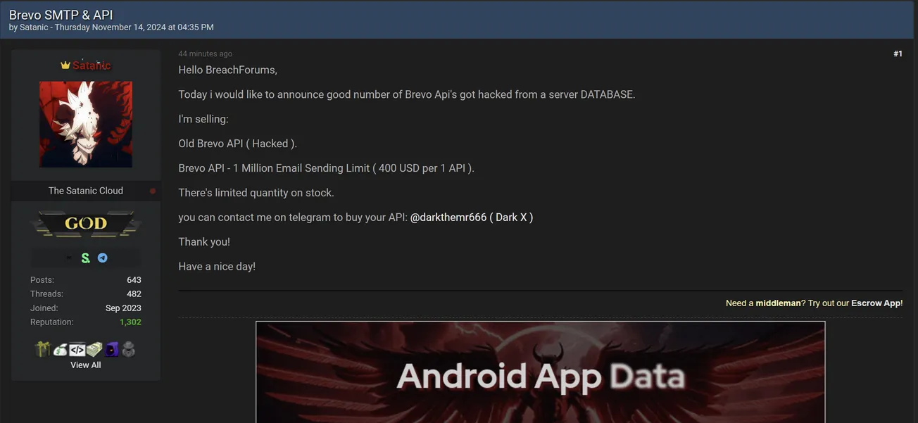 Satanic is Allegedly Selling Access of Brevo APIs
