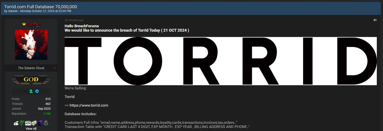 🚨 Title: Alleged database sale of Torrid