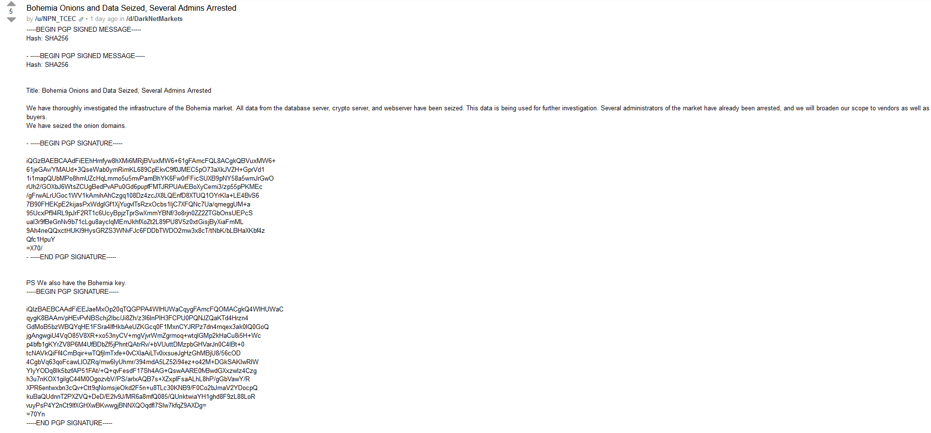 Dread (LEA PGP Signing): http://dreadytofatroptsdj6io7l3xptbet6onoyno2yv7jicoxknyazubrad[.]onion/post/8292266048c094ef1a02