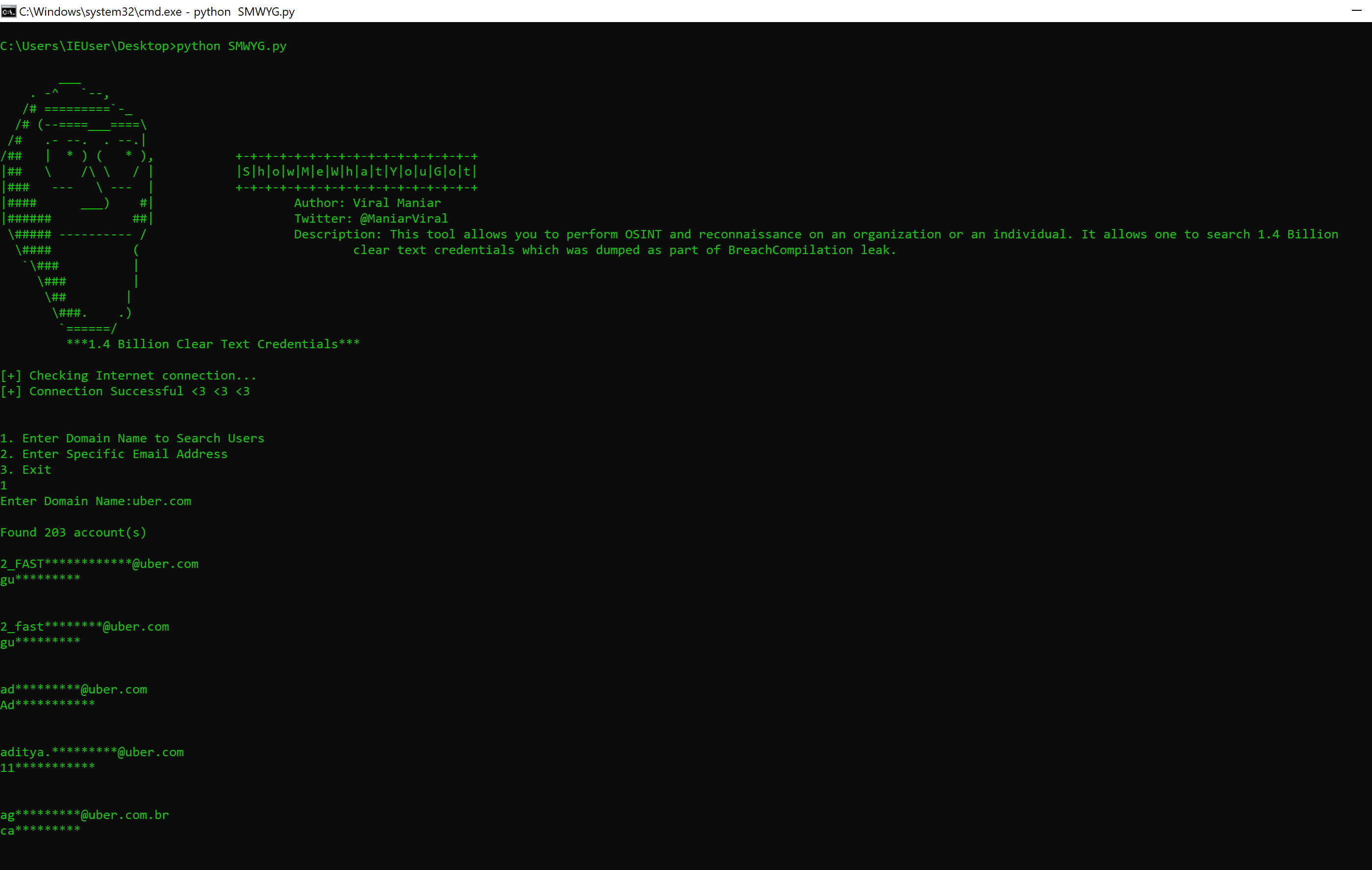 This tool allows you to perform OSINT and reconnaissance on an organisation or an individual. It allows one to search 1.4 Billion clear text credentials which was dumped as part of BreachCompilation leak. This database makes finding passwords faster and easier than ever before.