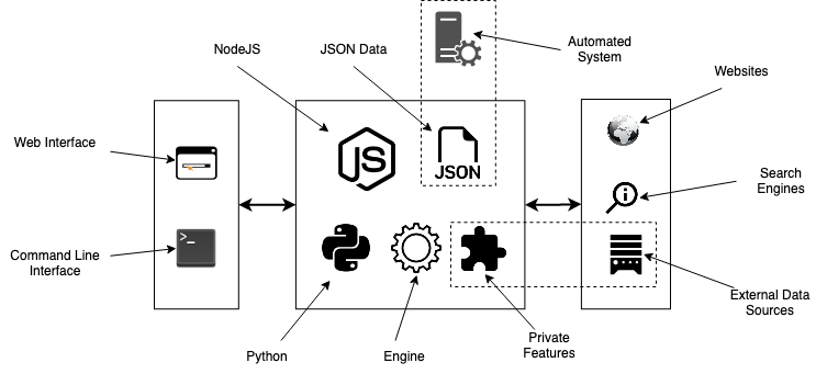 - DuckDuckGo API, Google API, NodeJS, bootstrap, selectize, jQuery, Wikipedia, font-awesome, selenium-webdriver & tesseract.js
