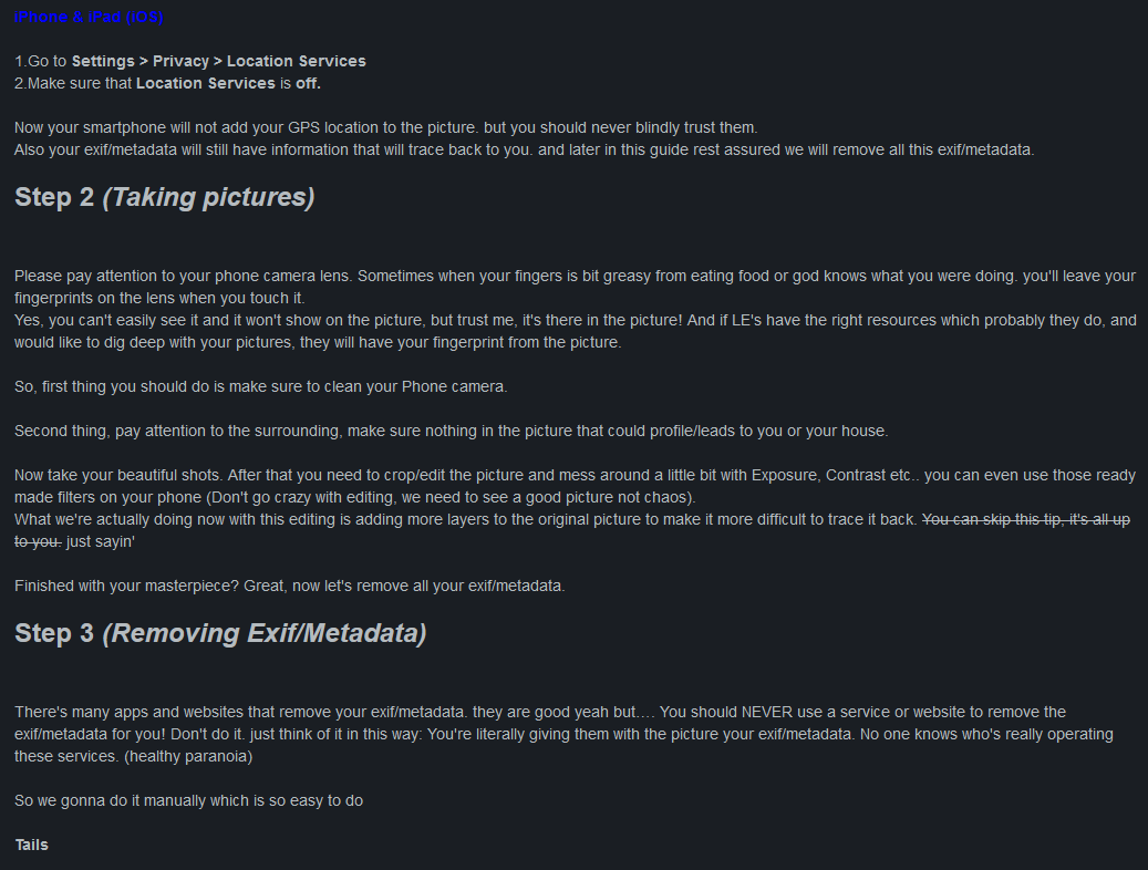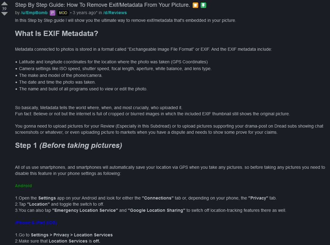 There's many apps and websites that remove your exif/metadata. they are good yeah but…. You should NEVER use a service or website to remove the exif/metadata for you! Don't do it. just think of it in this way: You're literally giving them with the picture your exif/metadata. No one knows who's really operating these services. (healthy paranoia)
