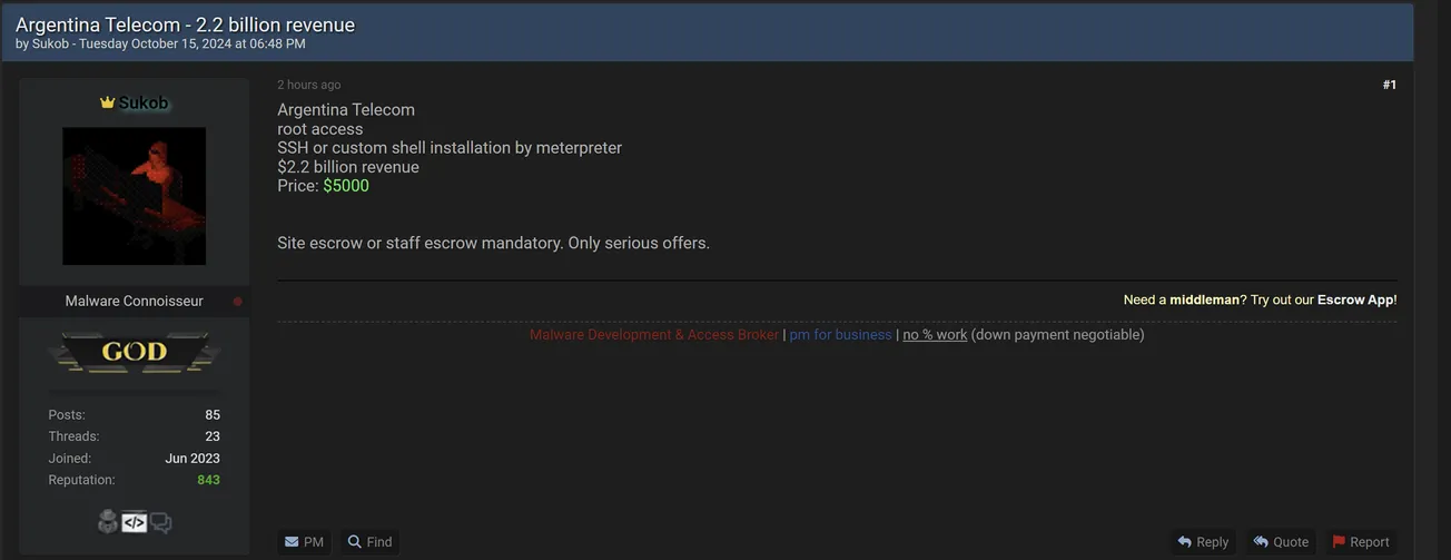 Sukob is Allegedly Selling Root Access to an Unidentified Telecom Company in Argentina With a Revenue of $2.2 Billion
