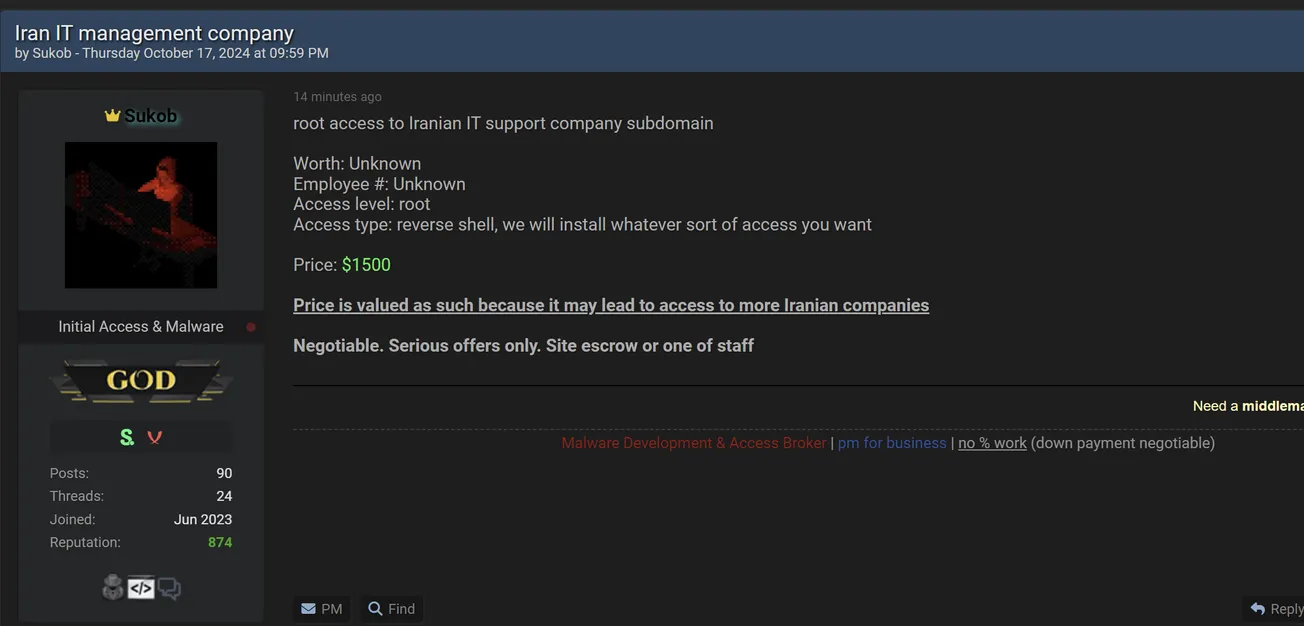 Sukob is Allegedly Selling Shell Root Access to an Unidentified IT Company in Iran
