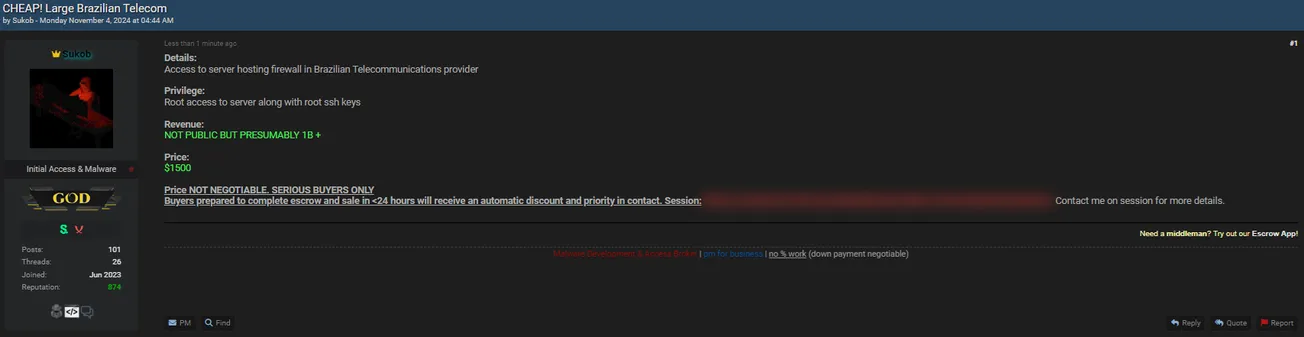 Sukob is Allegedly Selling Unauthorized Access to a Telecommunication Company in Brazil