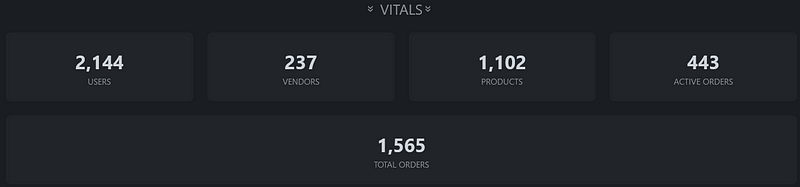 SuperMarket provides Vitals of the marketplace. As of January 9th, 2024, the market has 2,144 users, 237 vendors, 1,102 products, 443 active orders, and 1,565 total orders.