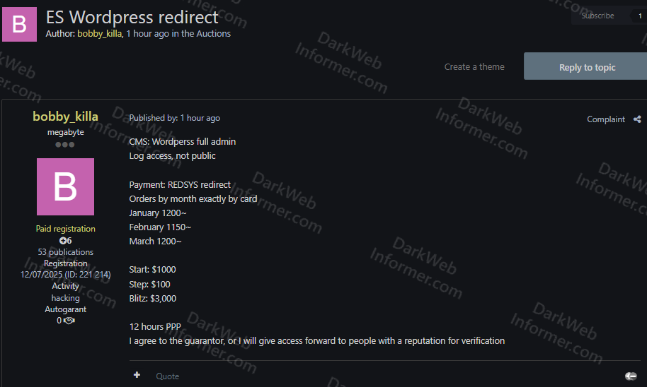 A threat actor going by bobby_killa is auctioning full WordPress admin access to an unnamed Spanish e-commerce website that processes payments through REDSYS, Spain's dominant card payment processing system used by the vast majority of Spanish banks and online retailers. The listing is posted in the auctions section of a Russian-language forum and includes specific monthly order volumes, making this a financially motivated access sale rather than a data breach.