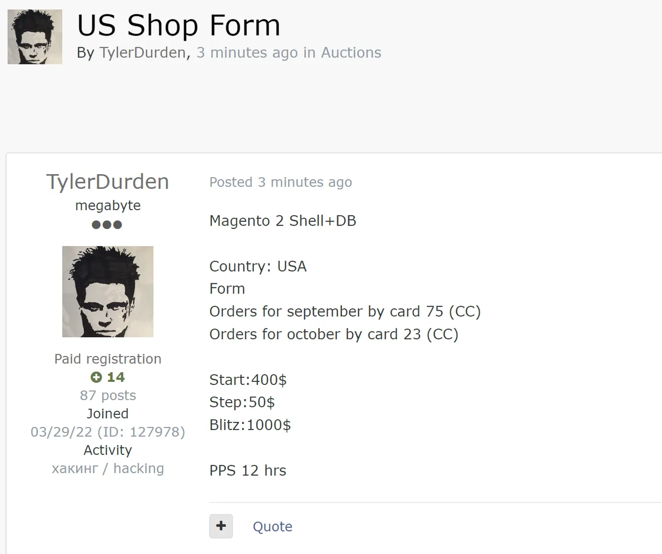TylerDurden is Allegedly Selling a Database of an Unidentified shop in the USA