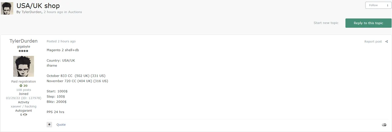 TylerDurden is Allegedly Selling Access to an Unidentified Magento 2-Based E-commerce Platforming in the USA and UK