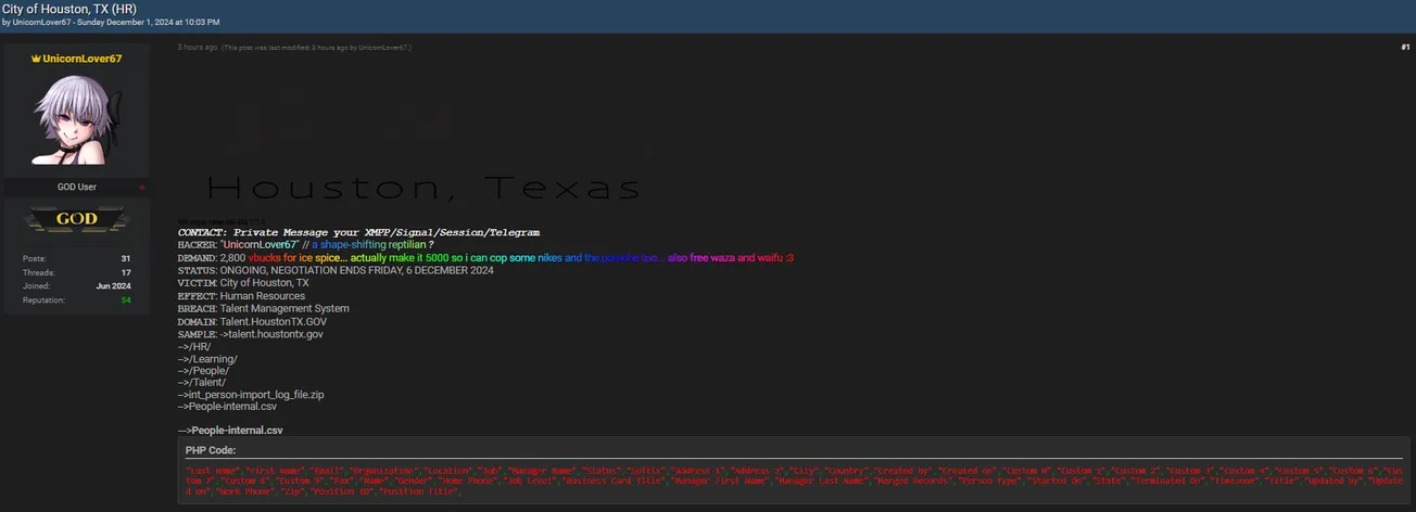 UnicornLover67 Claims to be Selling the Data of City of Houston