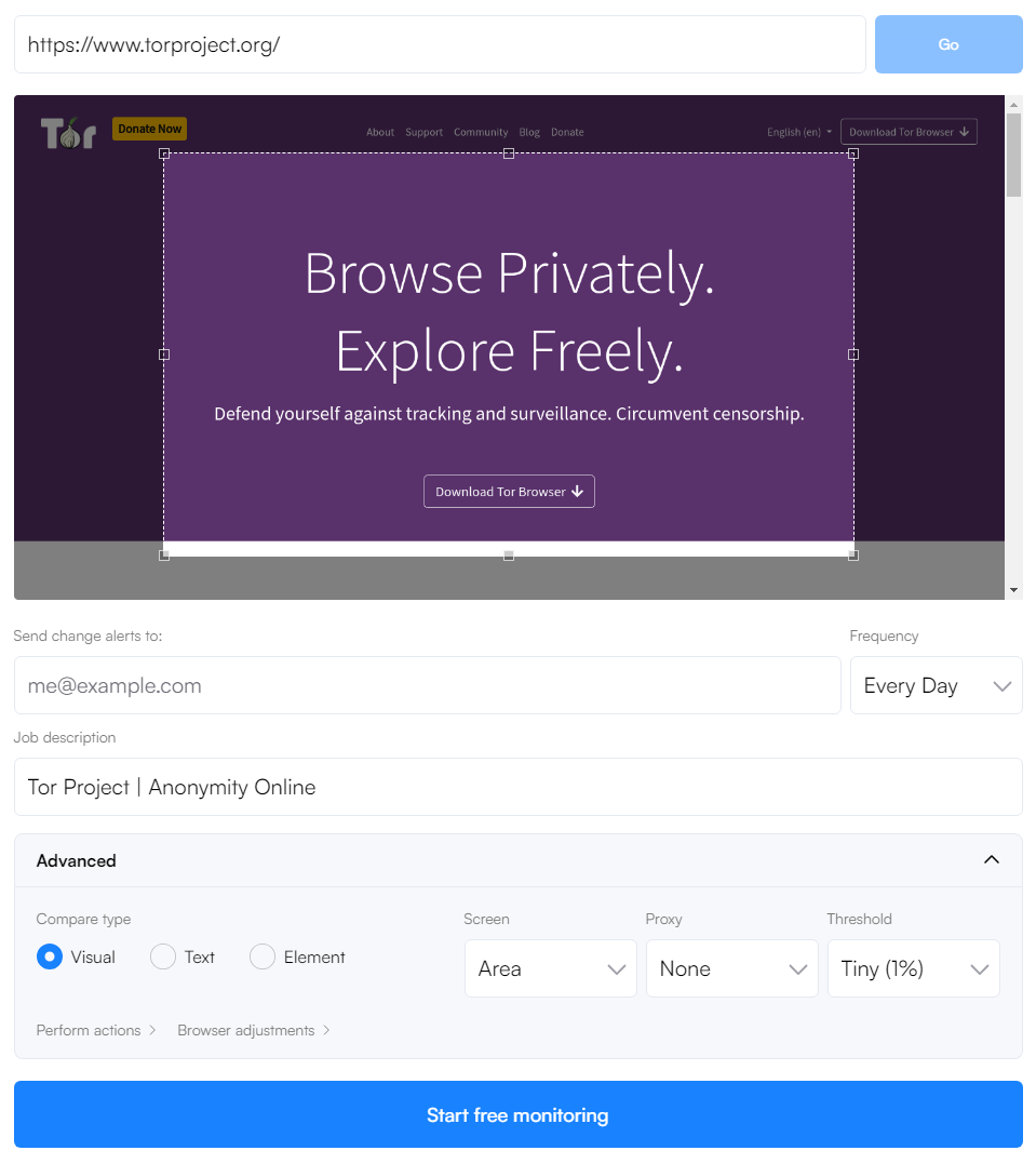 - Comparison Types: Users can choose different types of comparisons, such as visual comparison, text comparison, or selecting specific areas of the page to monitor.