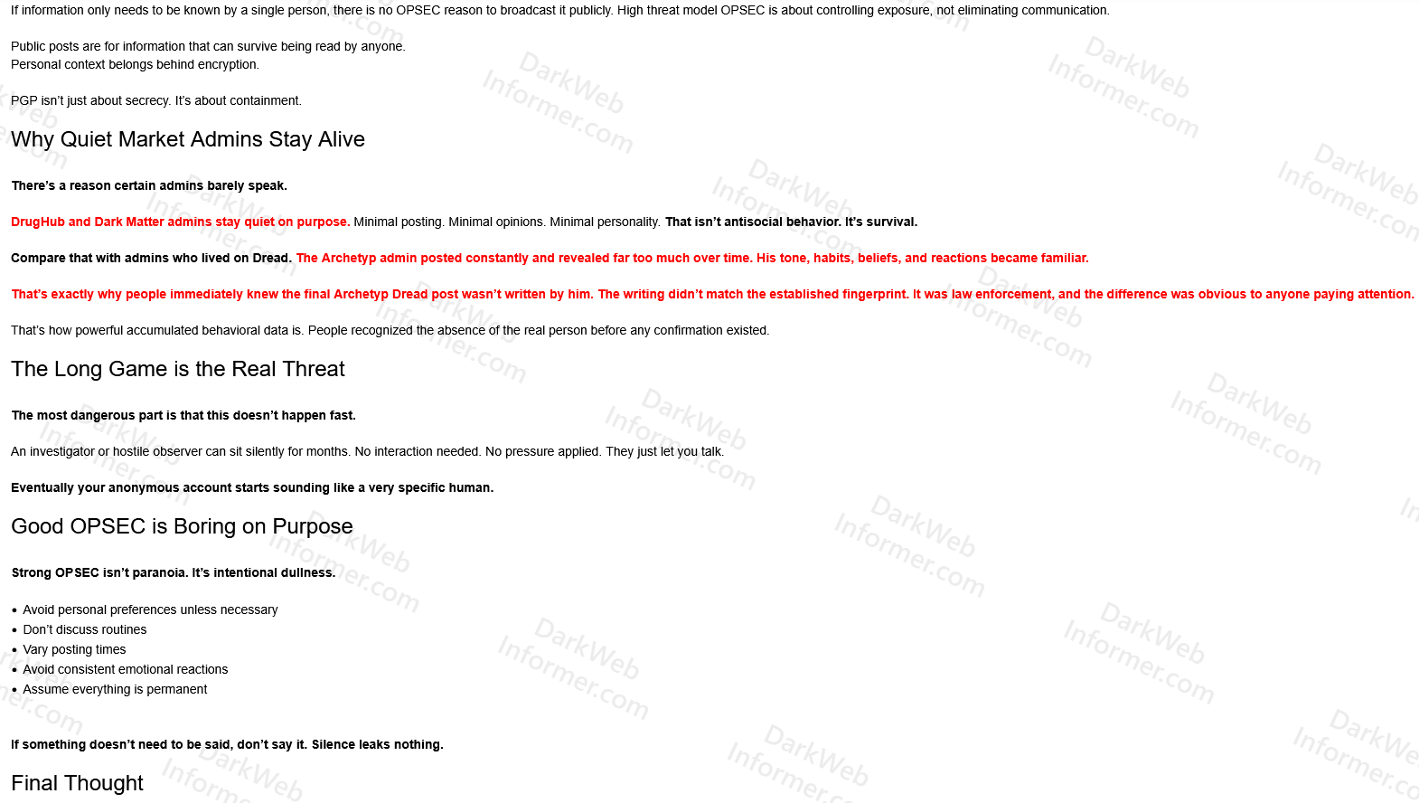 Compare that with admins who lived on Dread. The Archetyp admin posted constantly and revealed far too much over time. His tone, habits, beliefs, and reactions became familiar.