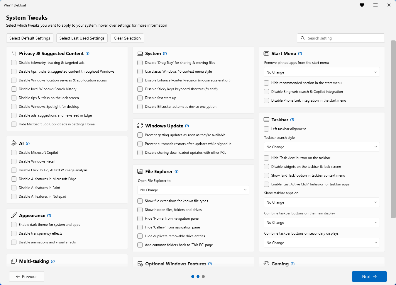 Windows updates can undo changes. Major Windows feature updates have a history of re-enabling telemetry settings, reinstalling removed apps, and resetting interface customizations. You may need to re-run the script after significant updates. This isn't a Win11Debloat limitation — it's a Windows behavior.