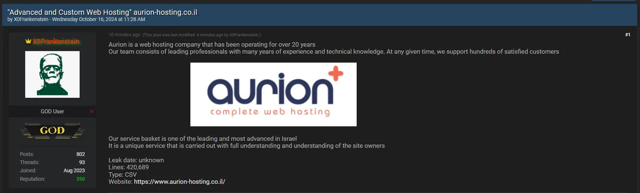 X0Frankenstein has Allegedly Leaked Data of Aurion Hosting