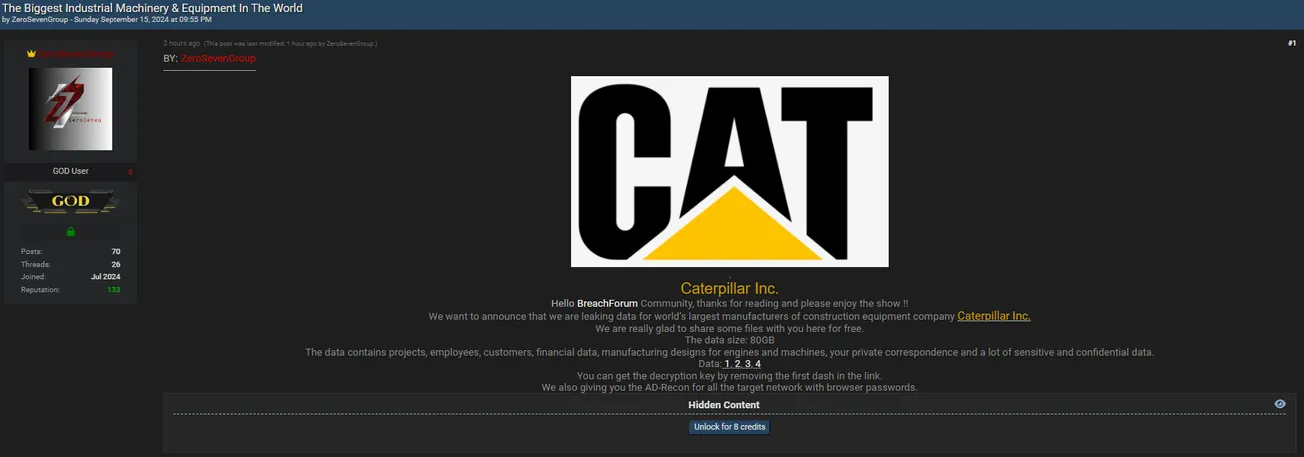 ZeroSevenGroup Allegedly Leaked Data of Caterpillar Inc