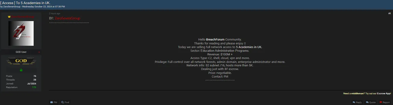 ZeroSevenGroup is Allegedly Selling Access to Five Unidentified Institutions in the UK