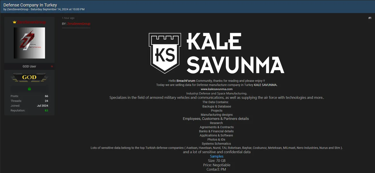 ZeroSevenGroup is Allegedly Selling the Database of KALE SAVUNMA